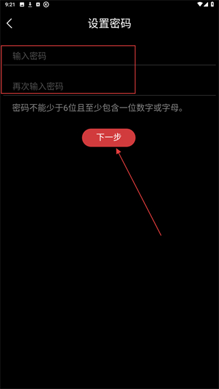 5、進(jìn)入到最后一步,設(shè)置好密碼后點(diǎn)擊下一步即可完成注冊。