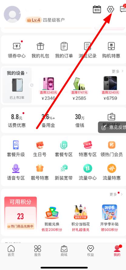 1、打開中國聯(lián)通app,點擊底部導(dǎo)航欄我的,再點擊右上角設(shè)置圖標。