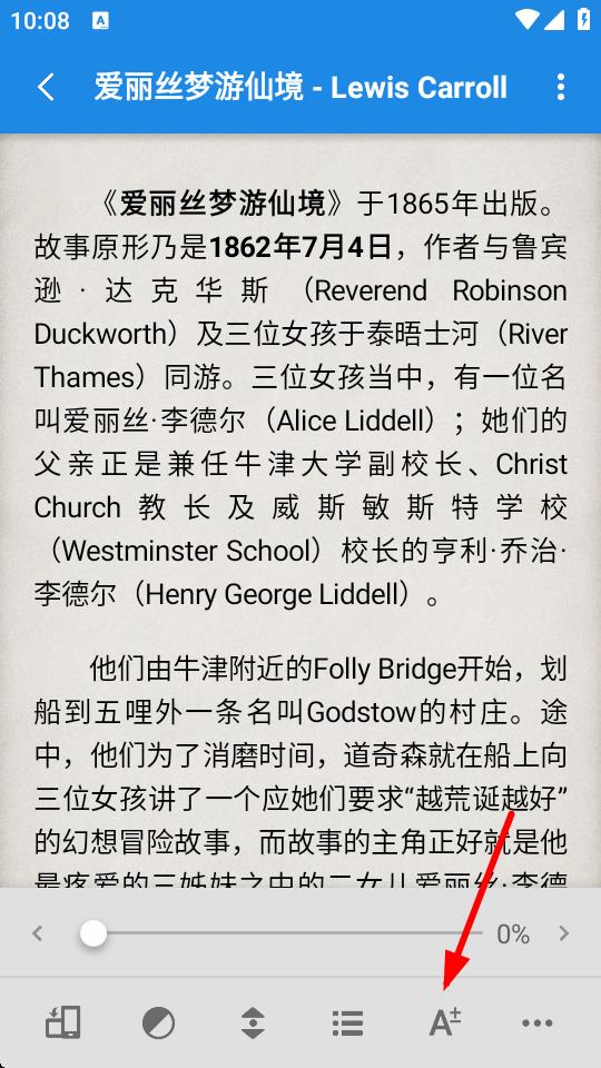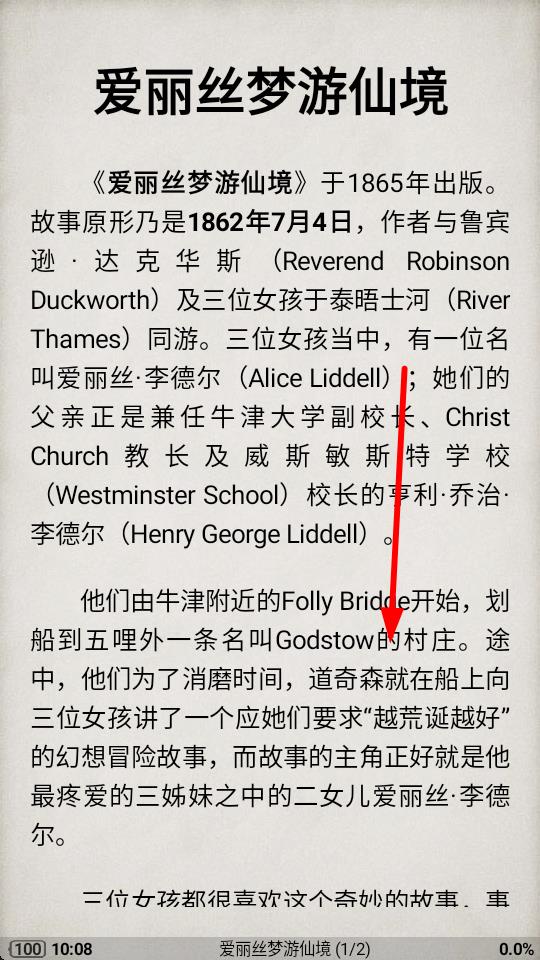 1、打開(kāi)靜讀天下軟件,在最近閱讀中點(diǎn)擊要閱讀的書(shū)籍,比如愛(ài)麗絲夢(mèng)游仙境。