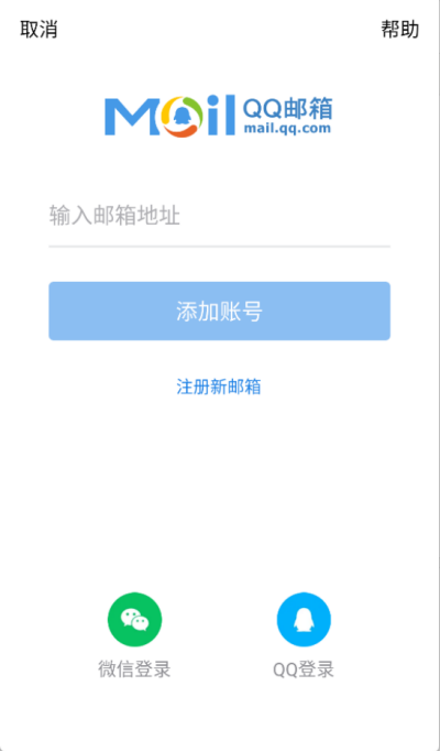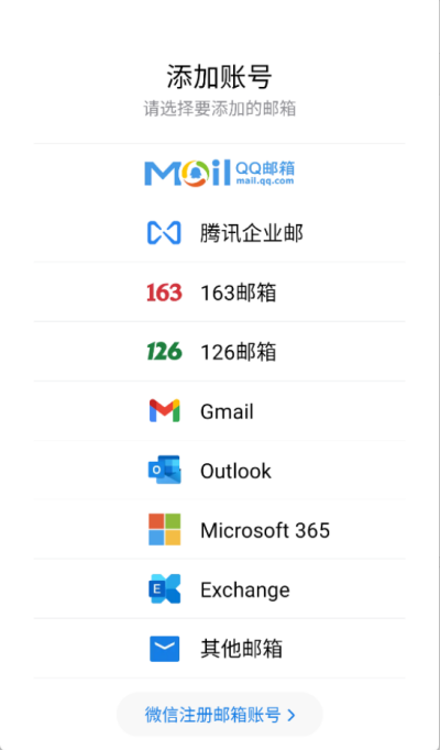 2、之后進入添加賬號界面,支持多個郵箱賬號登錄,可以使用qq郵箱、騰訊企業(yè)郵箱、163郵箱、126郵箱、Gmail郵箱等賬號登錄;