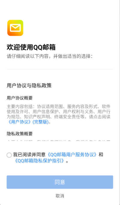 1、首先打開下載好的qq郵箱APP,進入軟件后會彈出用戶協(xié)議與隱私政策,點擊查看相應的協(xié)議,閱讀完畢后點擊同意進入;