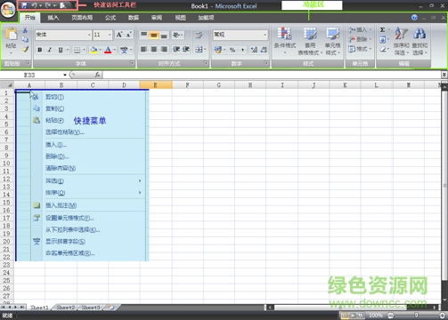 excel 2007的界面左上角圓圈部分是microsoft office按鈕。紅色部分是快速訪問(wèn)工具欄。綠色部分是功能區(qū)。藍(lán)色部分是鼠標(biāo)右鍵點(diǎn)擊單元格出現(xiàn)的微型工具欄和快捷菜單。