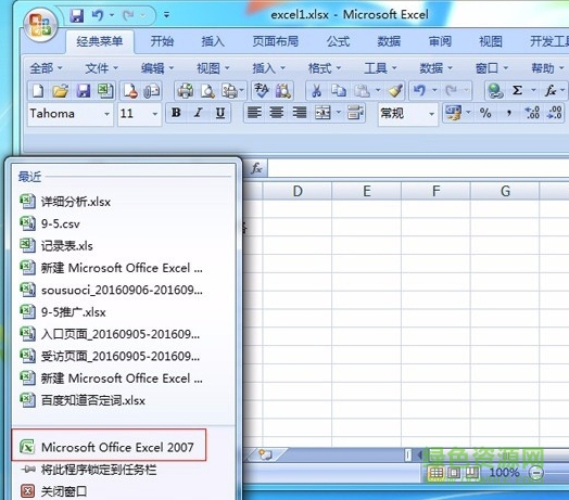 3.打開(kāi)第二個(gè)表格時(shí)候,不是雙擊打開(kāi),而是在電腦底部的任務(wù)欄上,右擊excel圖標(biāo),我們看到microsoft office excel 2007,然后點(diǎn)擊它