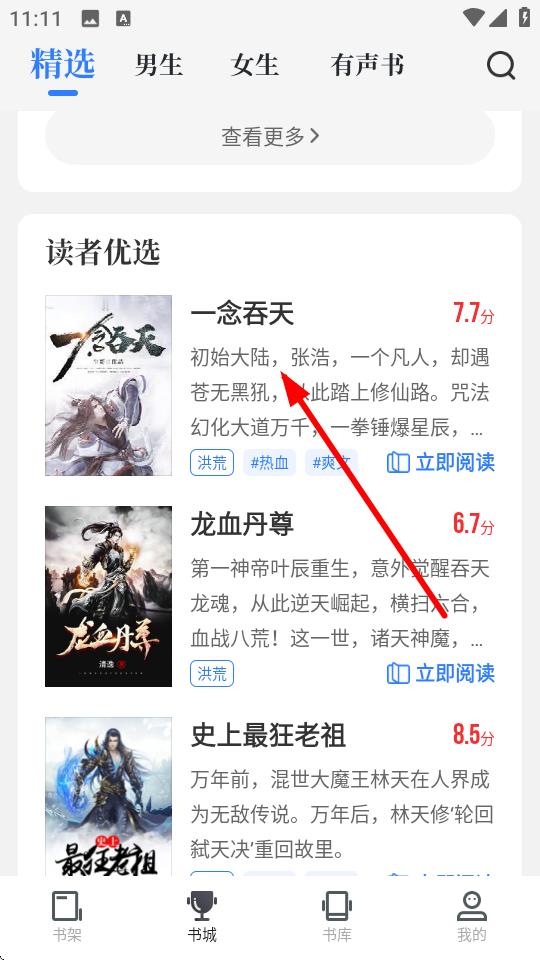 1、打開中文書城APP,在精選頁面的讀者優(yōu)選板塊中,點擊小說一念吞天。