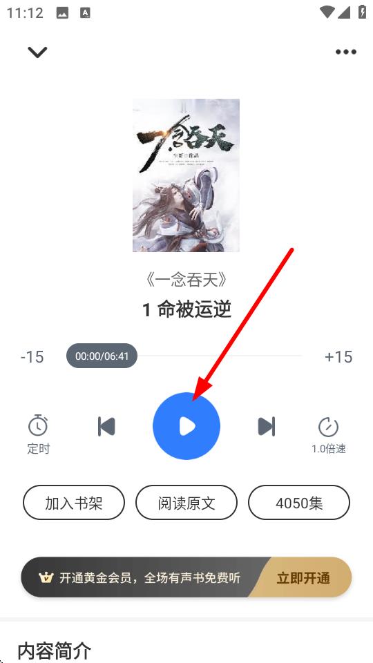 4、進(jìn)入聽書界面后,點擊中間的藍(lán)色播放按鈕,即可開始聽書。