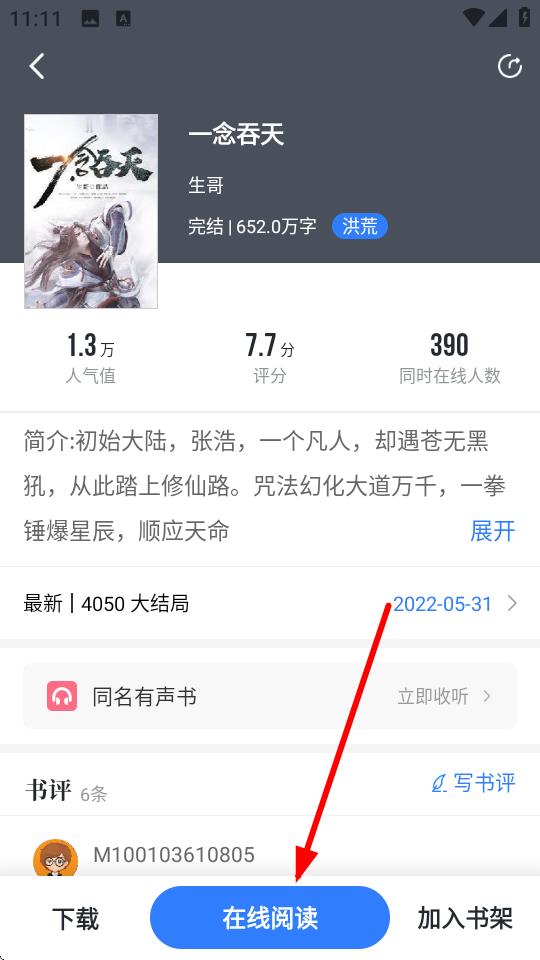 2、進(jìn)入小說一念吞天詳情頁后,點擊下方藍(lán)色的在線閱讀按鈕,進(jìn)入小說閱讀界面。