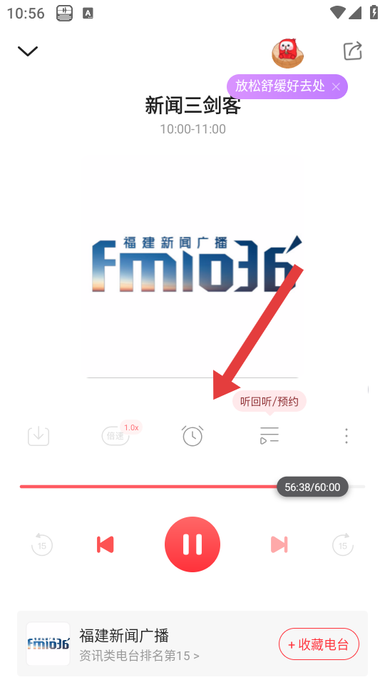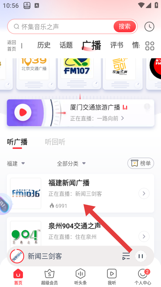 1、在蜻蜓FM的廣播頁面,點擊想要收聽的電臺如福建新聞廣播,進入該電臺的播放界面。