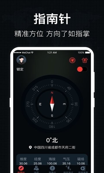 科技與傳統(tǒng)羅盤的結(jié)合,切合實景環(huán)境,為你實地分析方向。電子羅盤,羅盤指南針,以360°羅盤旋轉(zhuǎn)指南針樣式,簡單易用,幫你輕松辨別方向,還能查看經(jīng)度、緯度、海報高度、磁場。地圖導(dǎo)航為你實時指引方位方向,VR街景地圖讓你更易找到目的地;同事,還有多款專業(yè)的羅盤指南針皮膚供你挑選。