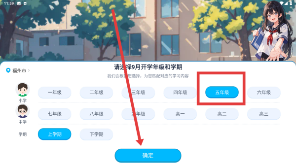 2、在年級(jí)更改頁(yè)面中,可以選中五年級(jí)后點(diǎn)擊確定進(jìn)行更改。