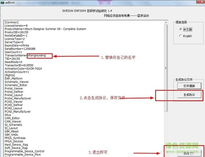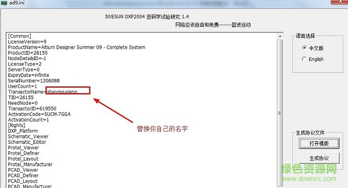 11.開始修改了,打開”AD9.4.0.20159修改補丁“文件夾,找到AD9KeyGen運行,然后點擊“打開模板”,加載ad9.ini,如想修改注冊名,只需修改: