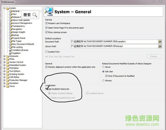 1.打開ad9,點擊右上角dxp,擇Preferences2、點擊“system”》“general”》勾選“use localized resources”