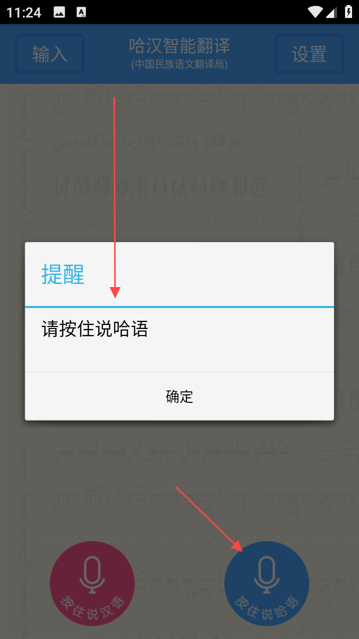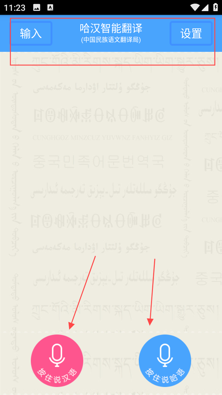 1、打開哈漢智能翻譯應(yīng)用進(jìn)入主界面,可見上方有輸入和設(shè)置選項(xiàng),下方有按住說漢語和按住說哈語兩個(gè)語音按鈕。