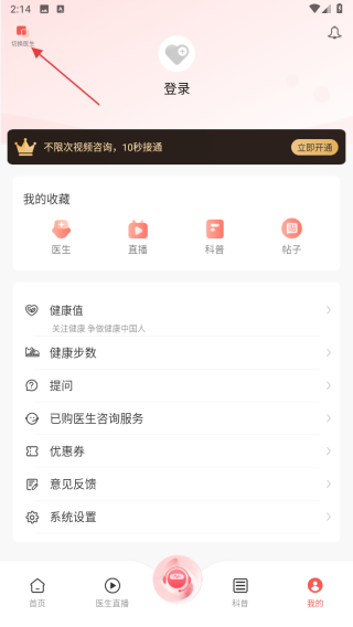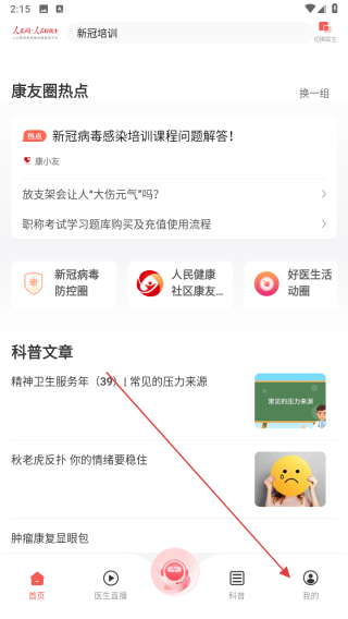 1、開啟人民好醫(yī)生APP,于首頁處,點擊底部導航欄里的我的選項,進入個人中心頁面,該頁面匯聚健康值、健康步數(shù)等個人健康及服務相關內(nèi)容。