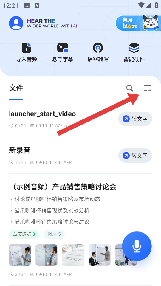 1、在訊飛聽(tīng)見(jiàn)主界面,點(diǎn)擊文件區(qū)域右上角的批量處理圖標(biāo),進(jìn)入文件批量處理頁(yè)面。