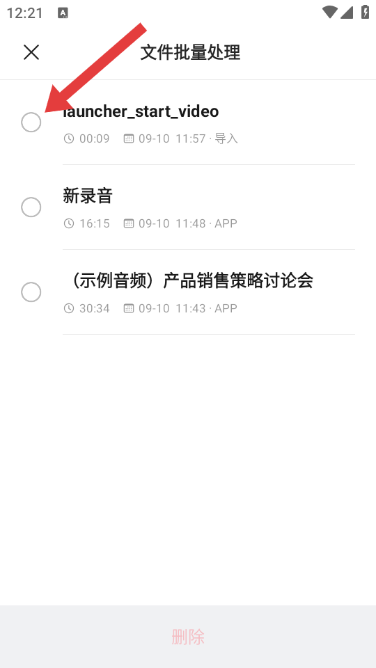 2、在文件批量處理頁(yè)面,點(diǎn)擊要?jiǎng)h除的錄音左側(cè)的圓形選擇框,勾選該錄音。