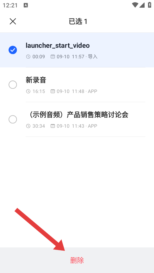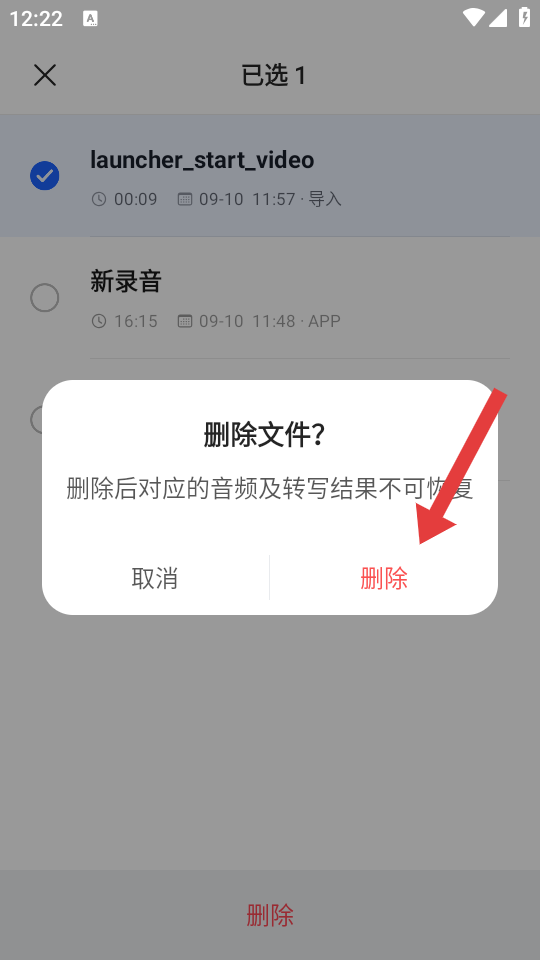 4、在刪除文件的確認(rèn)彈窗中,點(diǎn)擊刪除,即可刪除選中的錄音。