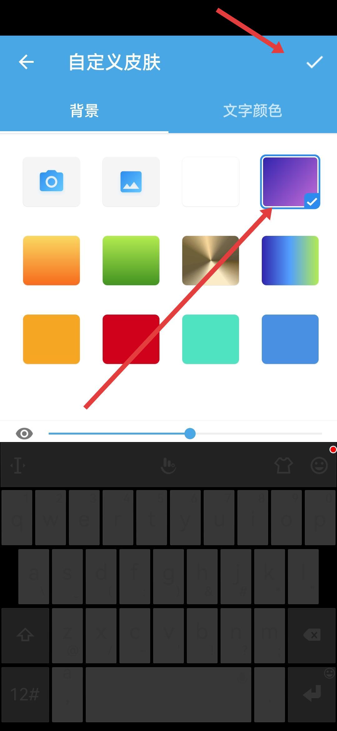 3、在自定義皮膚界面,選擇背景樣式如紫色漸變背景,點(diǎn)擊右上角對(duì)勾確認(rèn)選擇。