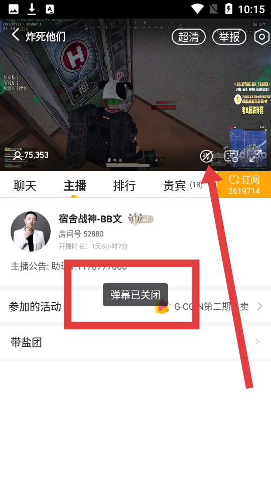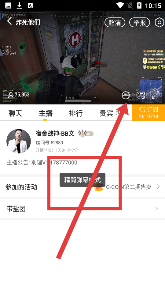 2、進(jìn)入直播間后,在直播間界面,找到圓形的彈幕開關(guān)圖標(biāo)并點(diǎn)擊一次,顯示開啟精簡(jiǎn)彈幕模式。