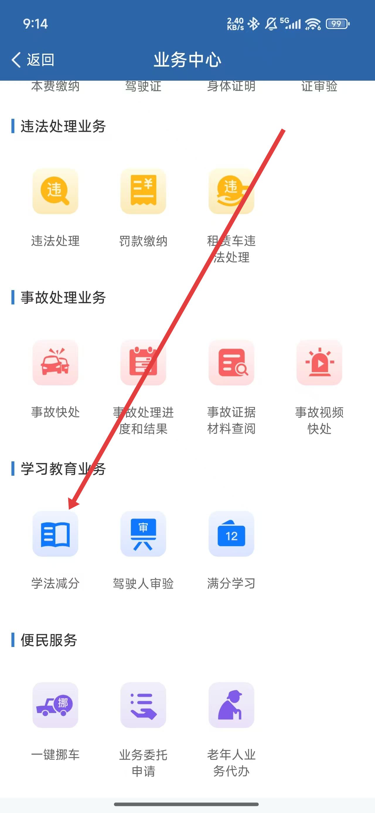 3、在進入到業(yè)務(wù)中心頁面后,可以點擊學法減分功能選項進入操作。