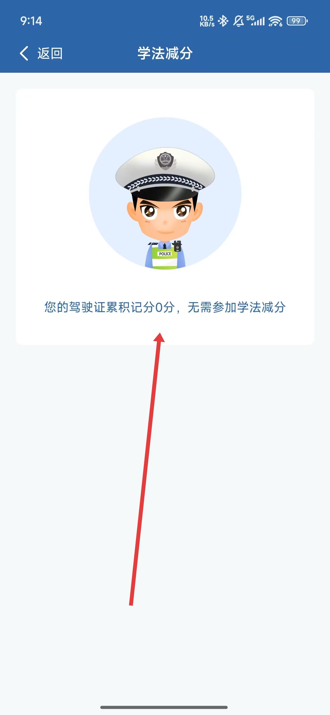 4、在跳轉(zhuǎn)到學法減分頁面后,顯示當前記分0分,無需參加學減分。
