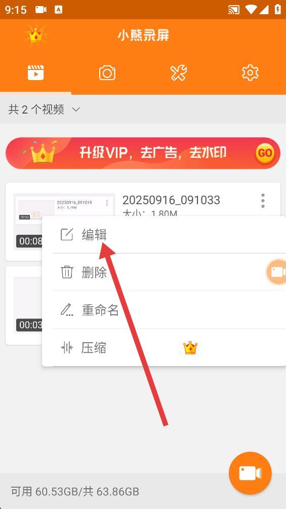 2、在彈出菜單中選擇編輯,進(jìn)入視頻編輯界面。