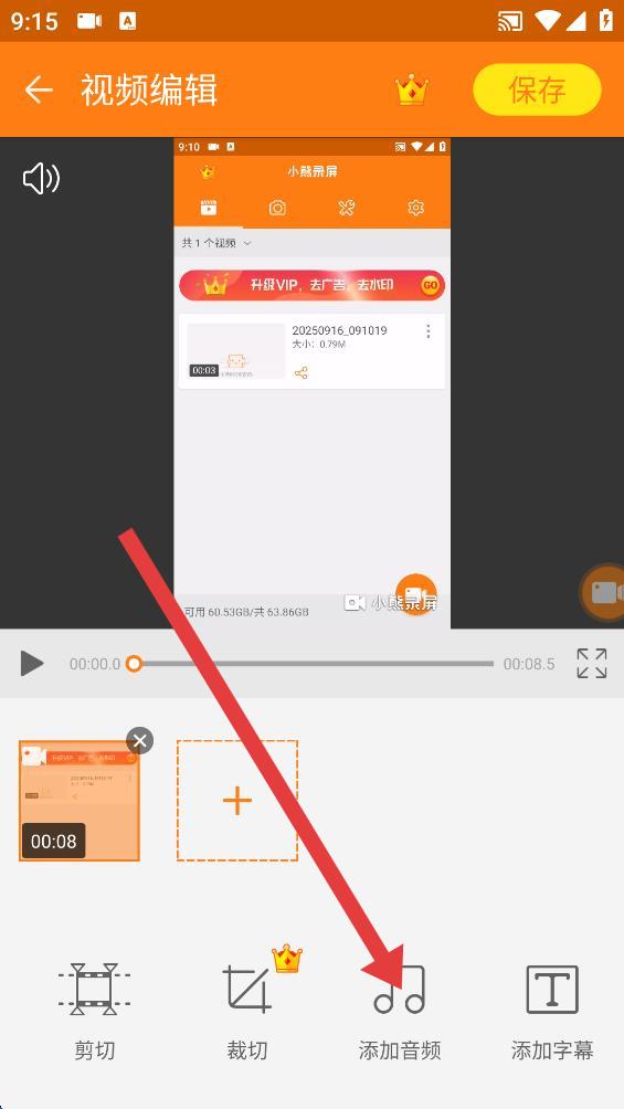 3、在視頻編輯界面中,找到并點(diǎn)擊添加音頻選項(xiàng)。