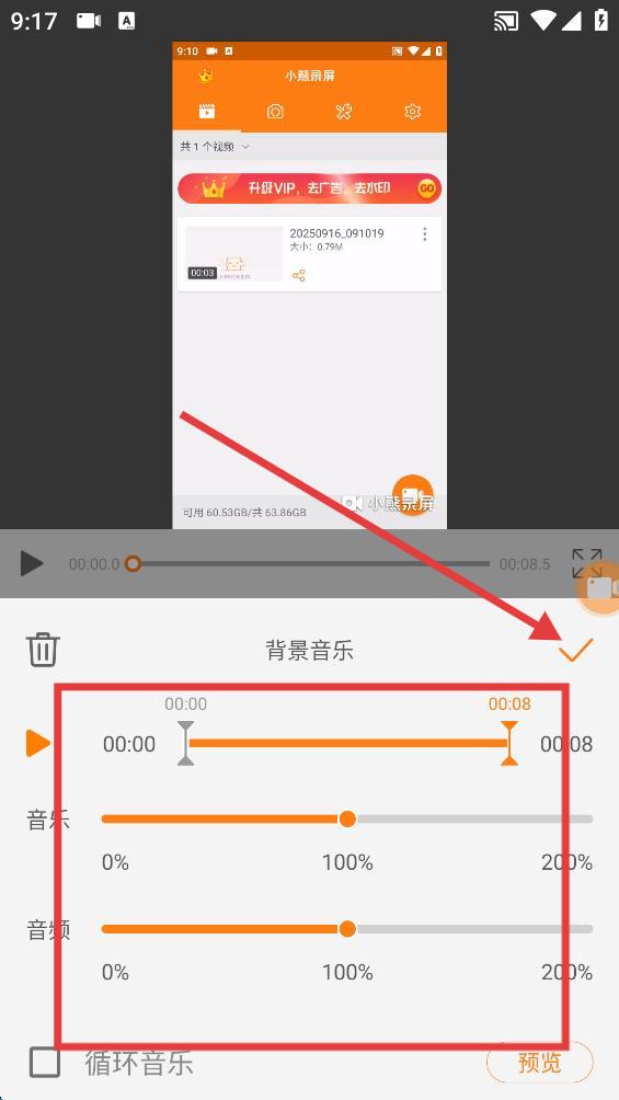 5、添加音樂后,確認(rèn)設(shè)置無誤后點(diǎn)擊界面中的確認(rèn)圖標(biāo)。