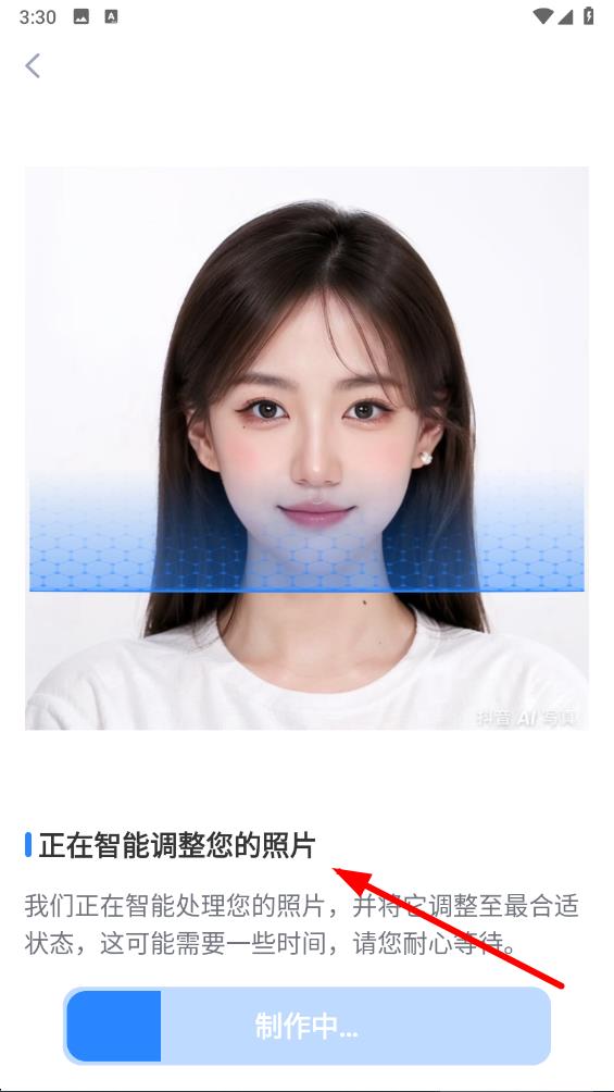 2、從相冊選取需要更換底色的證件照后,等待軟件智能調(diào)整照片,耐心等候制作進度。