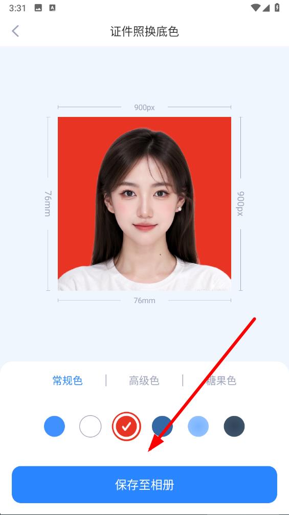 4、選好背景顏色后,點擊界面下方的保存至相冊按鈕,將換好底色的證件照保存。
