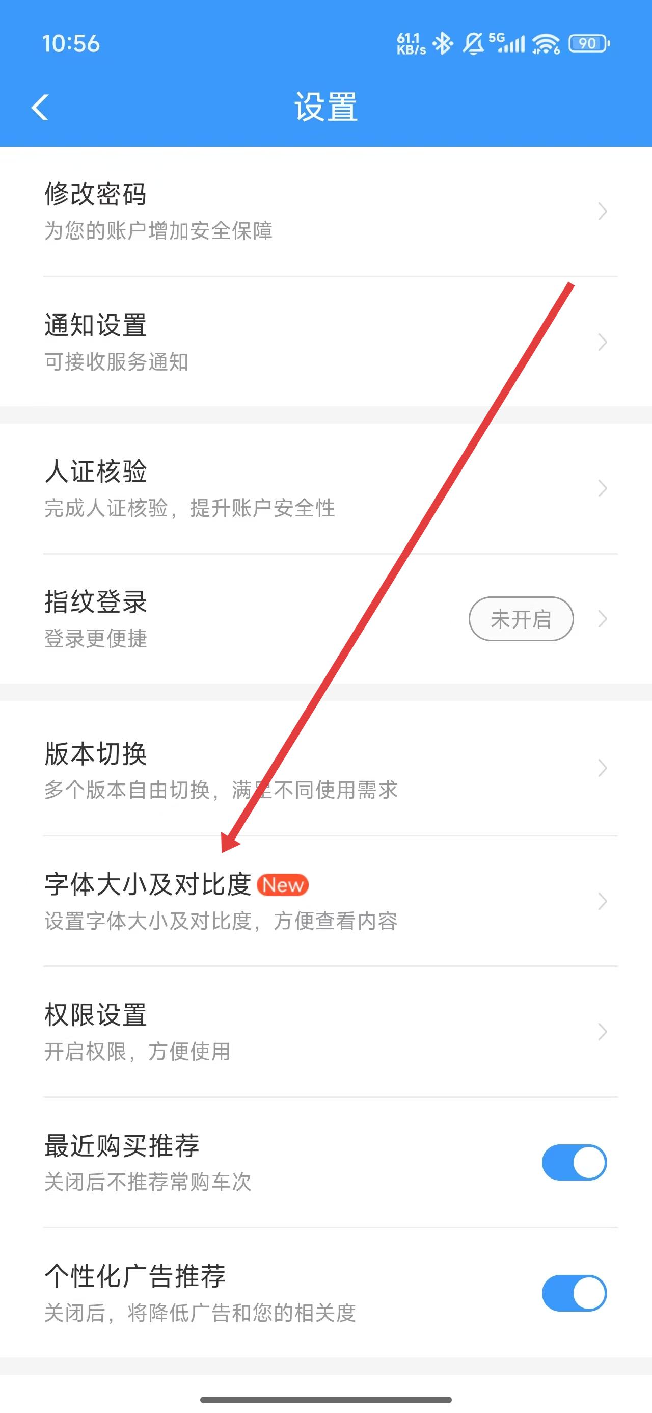 2、在進(jìn)入到設(shè)置頁(yè)面后,可以點(diǎn)擊字體大小及對(duì)比度選項(xiàng)進(jìn)入設(shè)置。