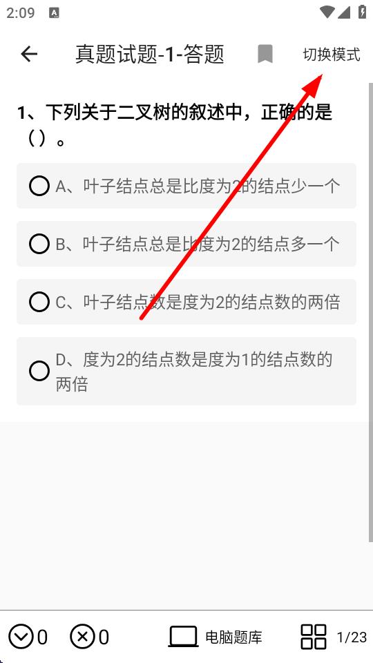 3、在真題答題的界面,點擊右上角切換模式,切換到學習的模式。