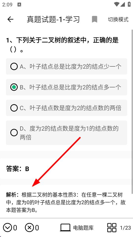 4、在學習模式下,即可查看題目解析,如二叉樹題目解析內(nèi)容。