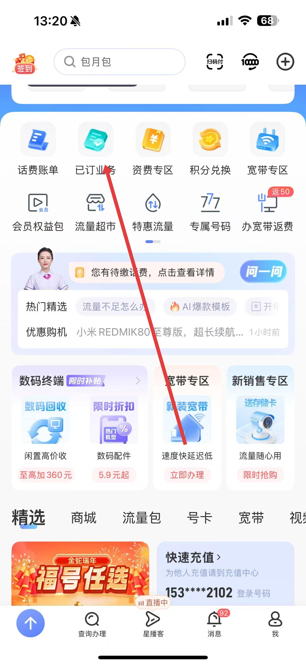 1、打開(kāi)中國(guó)電信APP進(jìn)入首頁(yè),點(diǎn)擊頁(yè)面上方的已訂業(yè)務(wù)選項(xiàng),進(jìn)入已訂業(yè)務(wù)查看界面。