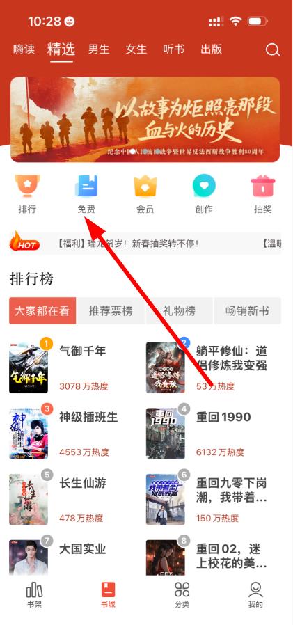 1、進(jìn)入首頁,點(diǎn)擊下方導(dǎo)航欄中的書城,然后在書城界面上方找到并點(diǎn)擊免費(fèi)選項(xiàng)。