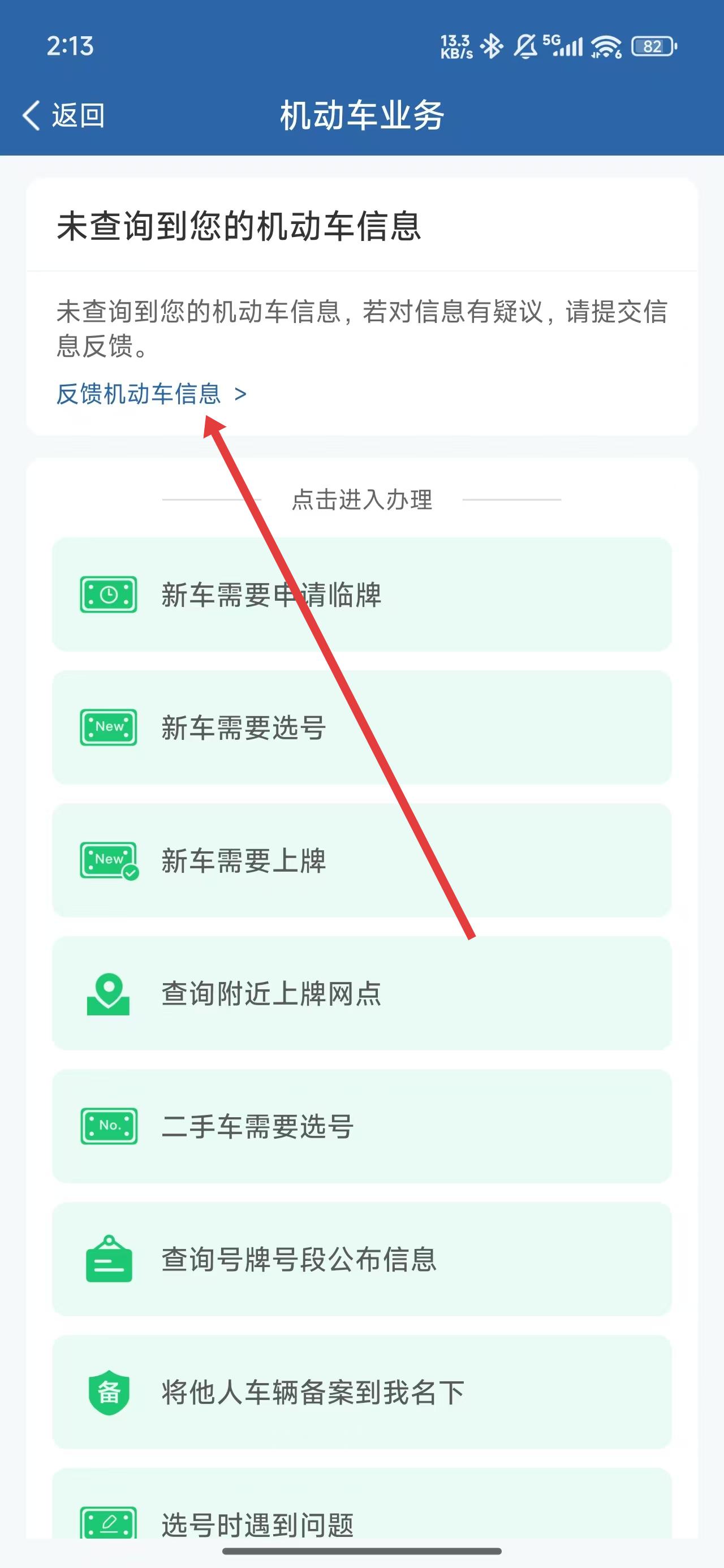2、在進(jìn)入到機(jī)動(dòng)車業(yè)務(wù)中,若未查詢到機(jī)動(dòng)車選項(xiàng)可點(diǎn)擊反饋機(jī)動(dòng)車信息按鈕。
