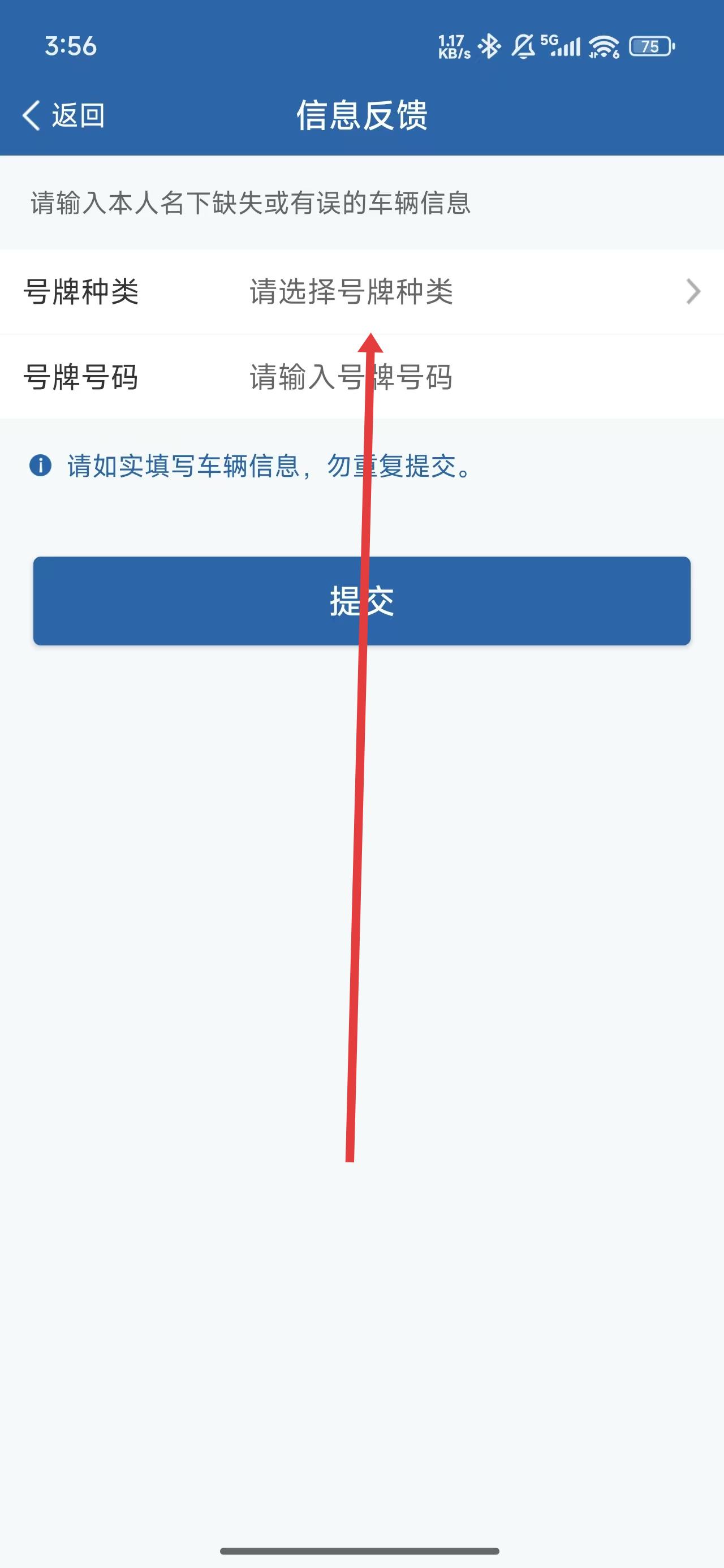 4、在進(jìn)入到信息反饋頁面中后,點(diǎn)擊選擇號(hào)牌種類填寫相關(guān)信息后,完成反饋。