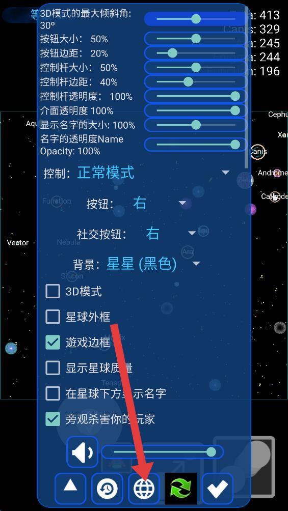 2、進(jìn)入設(shè)置界面后,滑動(dòng)屏幕找到并點(diǎn)擊底部類似地球的語言設(shè)置圖標(biāo)。