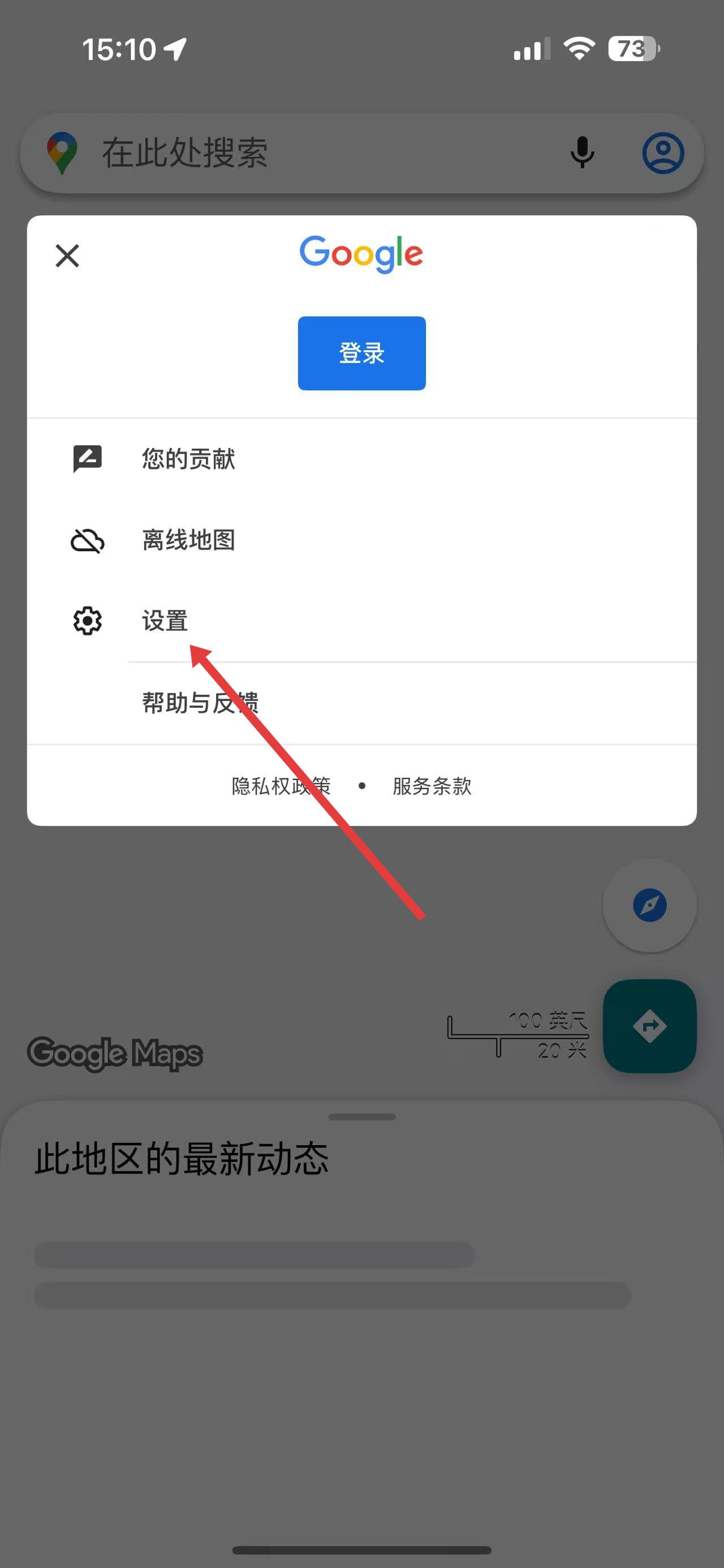 1、打開谷歌地圖應(yīng)用,點擊左上角區(qū)域,在彈出菜單里點擊設(shè)置選項進入設(shè)置頁面。