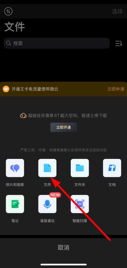 2、在彈出選項(xiàng)中,選擇要上傳的文件類型,比如文件。