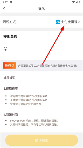 3、在提現(xiàn)頁面點(diǎn)擊提現(xiàn)方式,選擇微信提現(xiàn)。