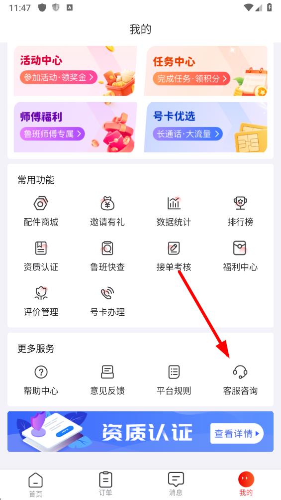 2、在個(gè)人界面的更多服務(wù)板塊中,找到并點(diǎn)擊客服咨詢選項(xiàng)。