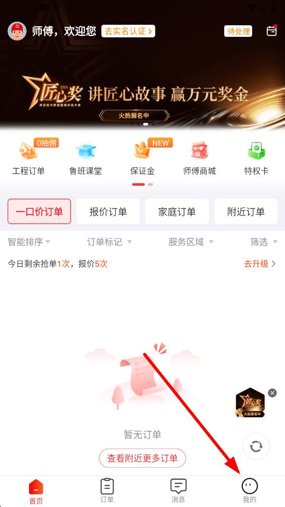 1、打開魯班到家app,點(diǎn)擊底部導(dǎo)航欄中的我的圖標(biāo)進(jìn)入個(gè)人界面。