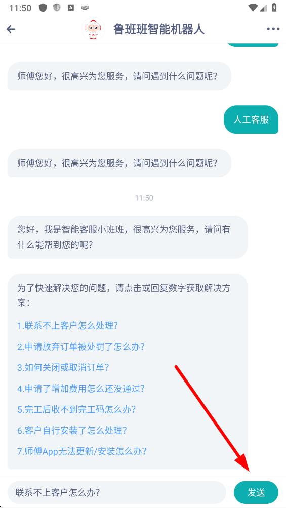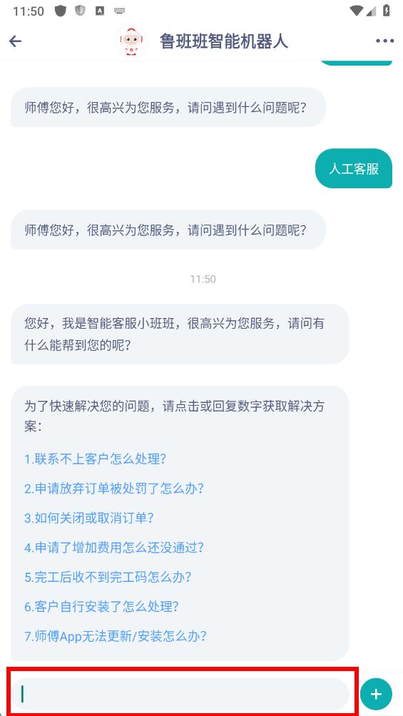 3、進(jìn)入與魯班班智能機(jī)器人對話界面后,在下方輸入框中輸入你遇到的問題。
