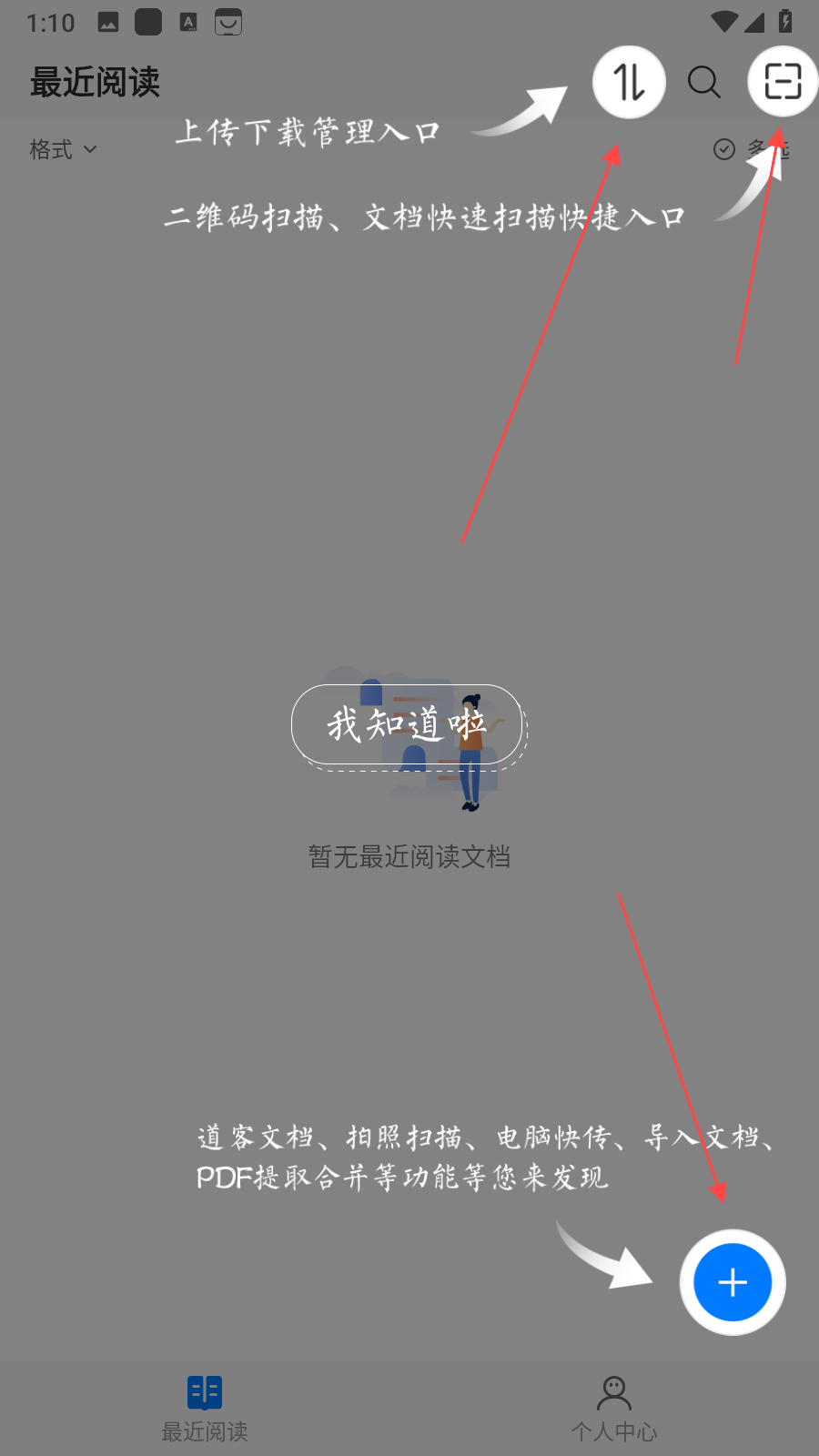 1、打開稻殼閱讀器進入最近閱讀界面,右上角有上傳下載管理入口、二維碼掃描與文檔快速掃描入口,點擊底部藍色加號按鈕可進行道客文檔、拍照掃描、電腦快傳等操作。