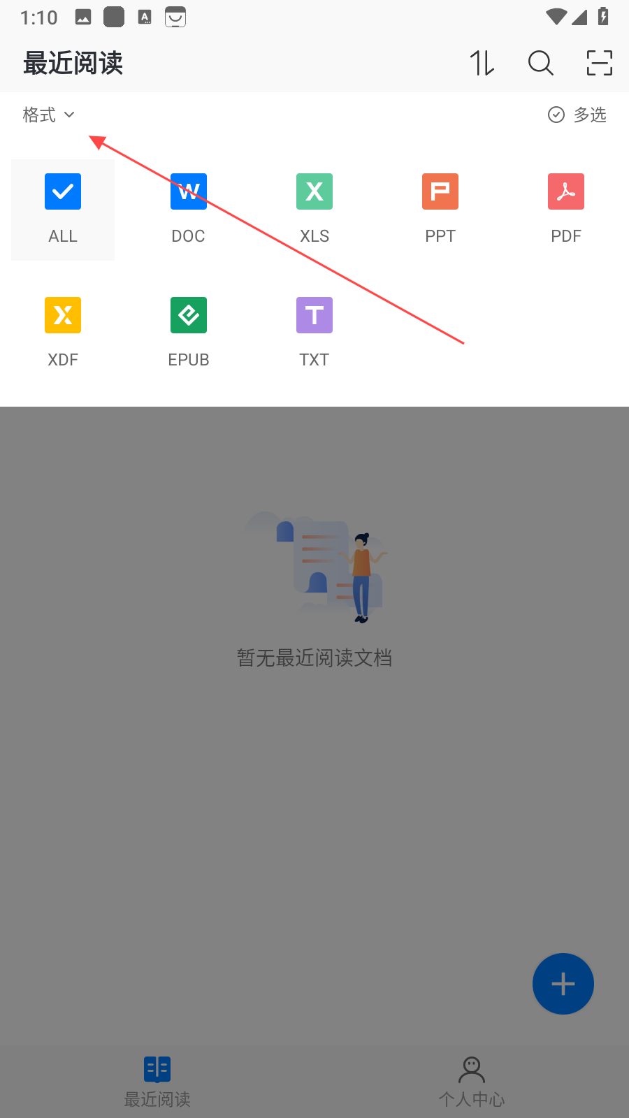 2、在最近閱讀界面點擊格式按鈕,能展開文檔格式篩選選項,包括ALL、DOC、XLS 、PPT等多種格式,按需選擇格式后即可篩選出對應格式的文檔方便查找。