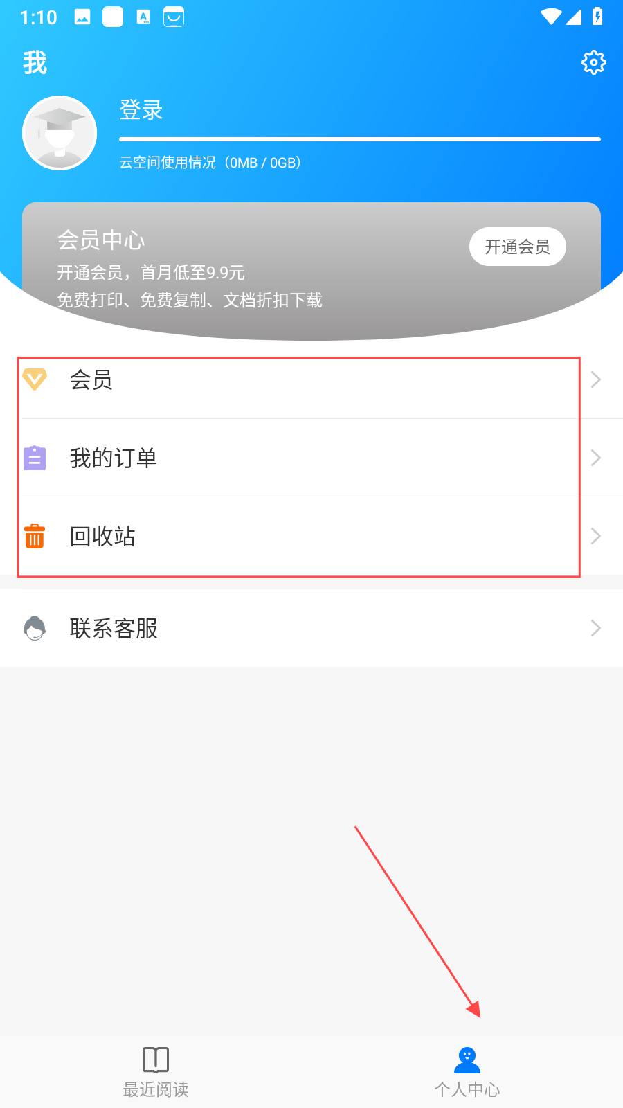 3、點擊底部導航欄的個人中心進入個人頁面,在這里可以進行登錄操作查看云空間使用情況,還能進入會員中心、查看我的訂單以及進入回收站進行相關操作。