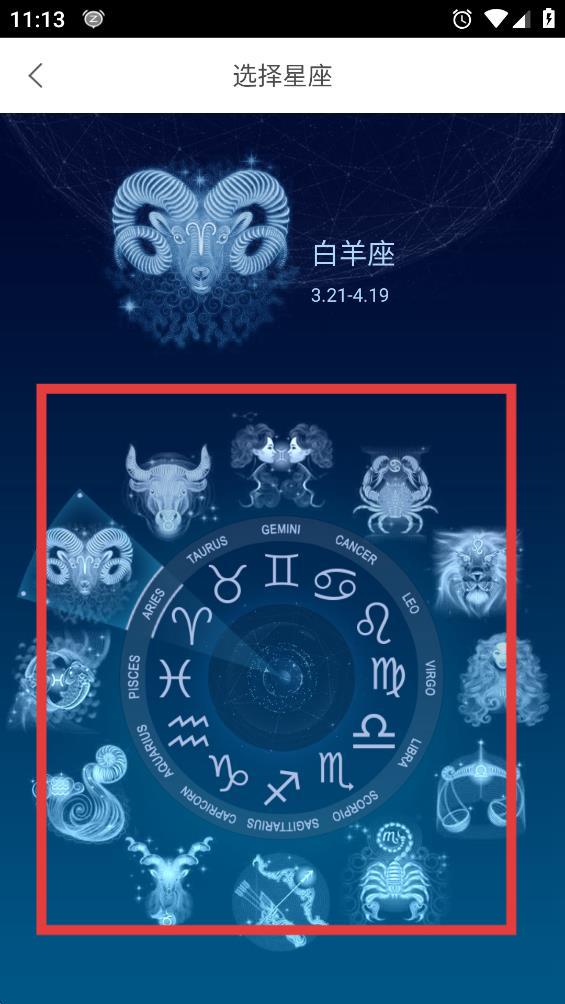 4、在選擇星座的界面中,點(diǎn)擊想要查看運(yùn)勢(shì)的星座圖標(biāo),即可查看該星座運(yùn)勢(shì)信息。