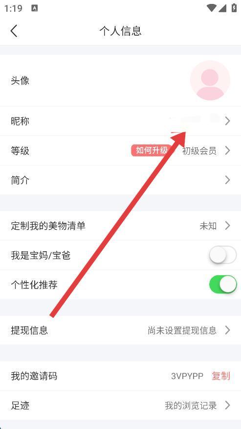 3、在個(gè)人信息頁(yè)面里,找到昵稱選項(xiàng)并點(diǎn)擊,進(jìn)入昵稱修改頁(yè)面。
