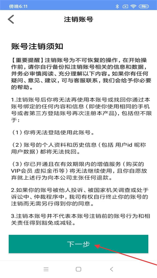 3、進入注銷賬號的頁面內,仔細閱讀后,點擊下一步的按鈕。