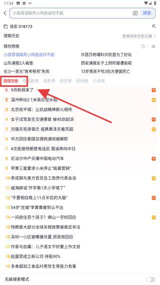 2、當前呈現(xiàn)輸入的頁面,向下滑動找到百度熱搜的字眼,根據(jù)熱門度進行排序,點擊即可查看。